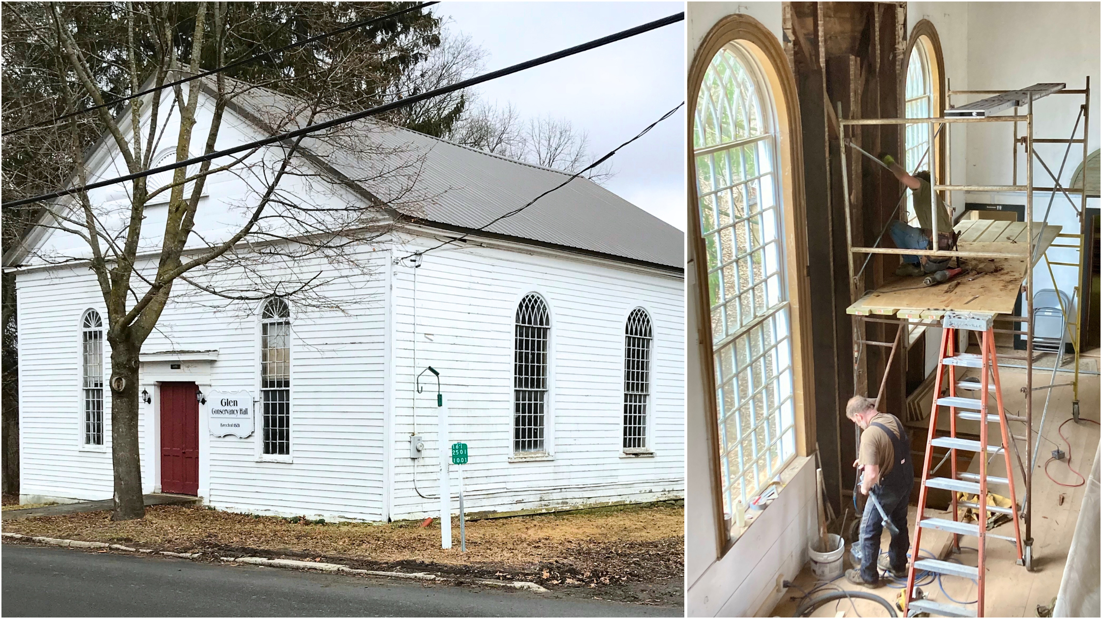 The Glen Conservancy was established in 2002 with the mission of engaging in educational and cultural activities in support of the built and natural environments, encouraging historic preservation, and preserving rural character and open spaces in the hamlet of Glen and greater Town of Glen, Montgomery County, NY. The timber-frame structure that is now called Conservancy Hall was built in 1830 for the congregation of the True Dutch Reformed Church of Glen and Charleston. It was in regular used for community meetings, pancake suppers, and cultural events until a major transverse beam and most of the ceiling collapsed due to hidden water damage in 2013. The Glen Conservancy acquired the building and, with the assistance of neighbors and volunteers, cleared the debris and reinforced the roofing truss system. They are now in the process of restoring the structure to return it to use as a community arts and cultural center.